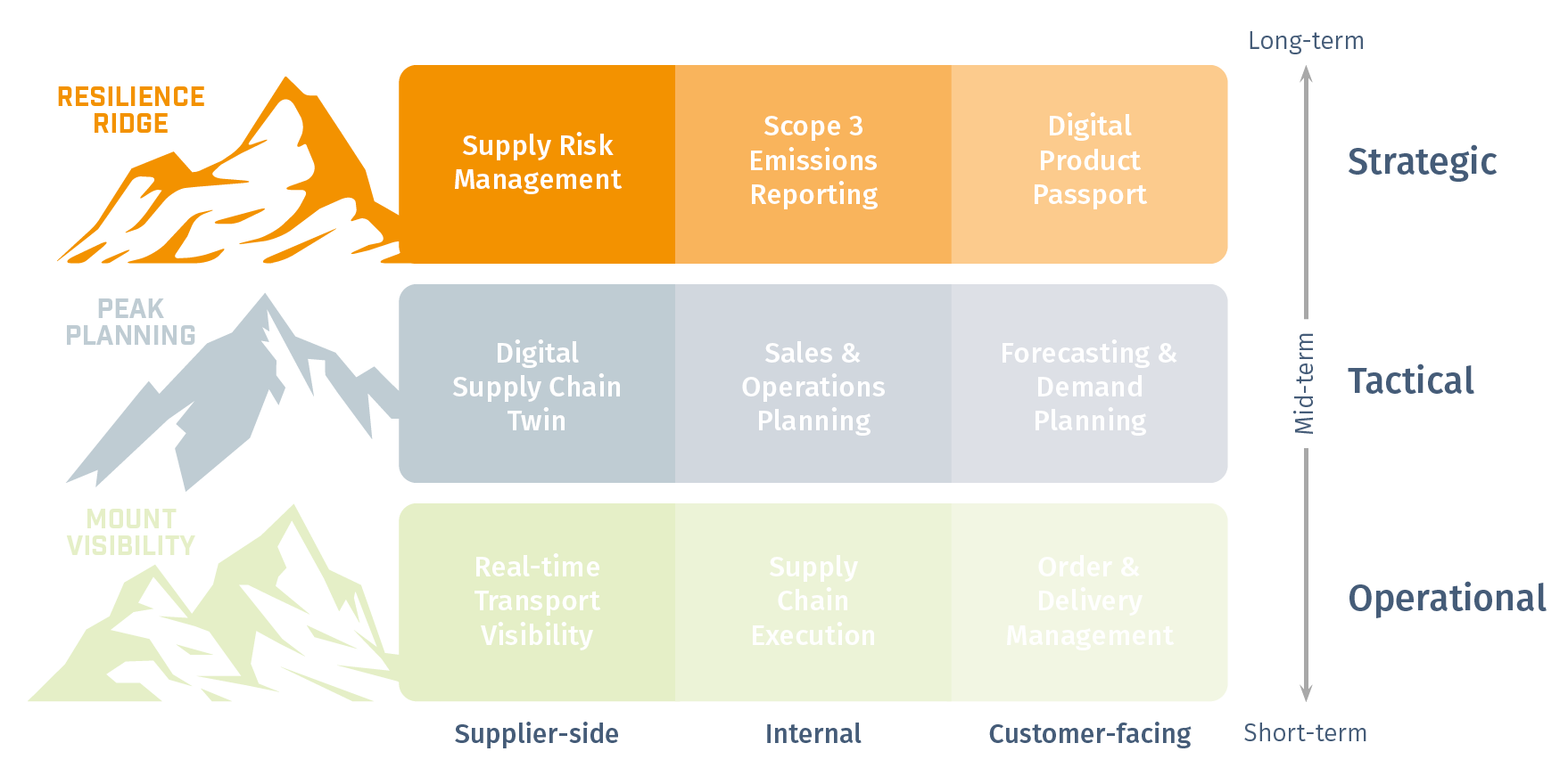 The matrix above shows how the three break‑out themes connect across the supply chain and decision horizon. From Resilience Ridge (strategic, long‑term) to Peak Planning (tactical, mid‑term) and Mount Visibility (operational, short‑term), each theme addresses a different layer of supply chain decision‑making — from suppliers to customers.